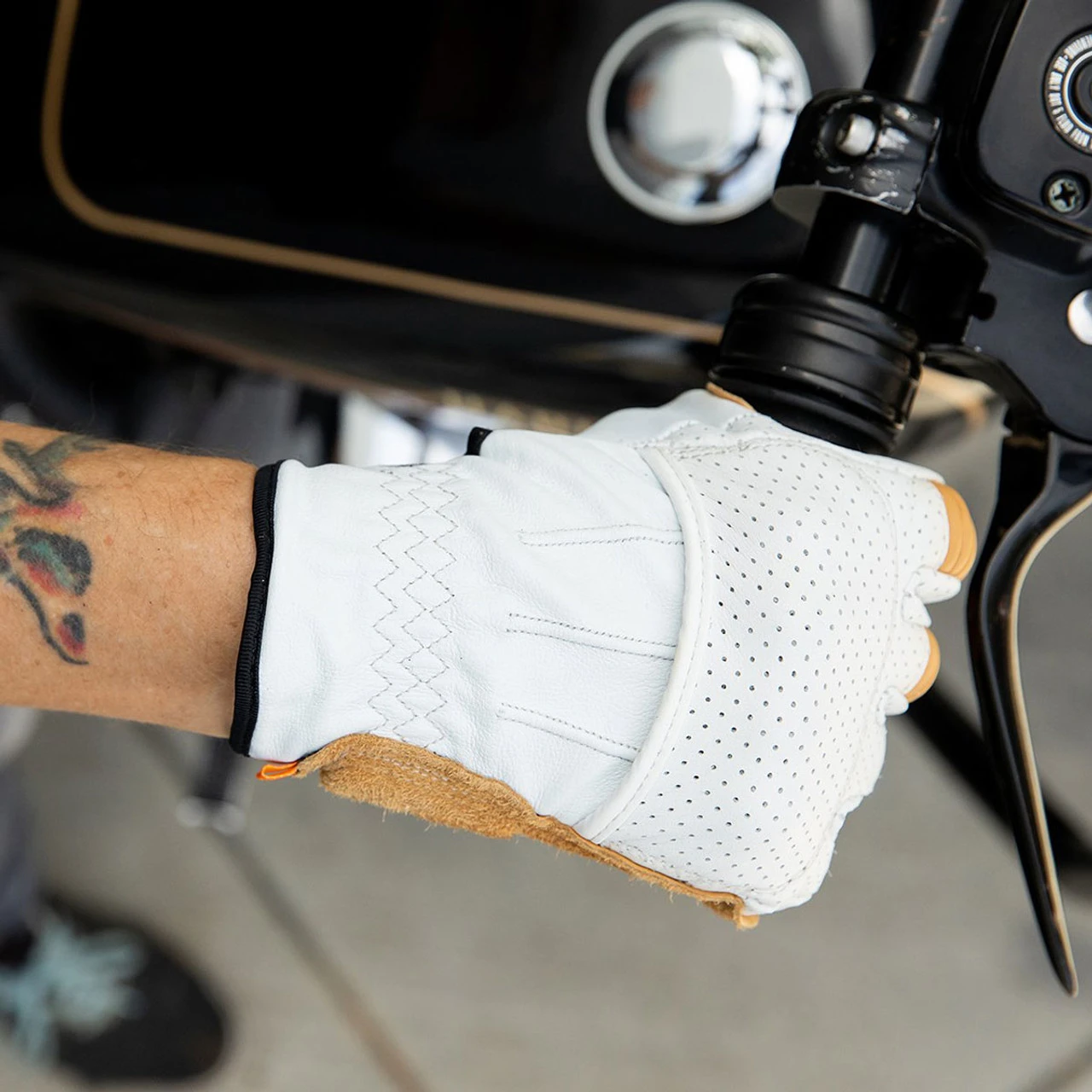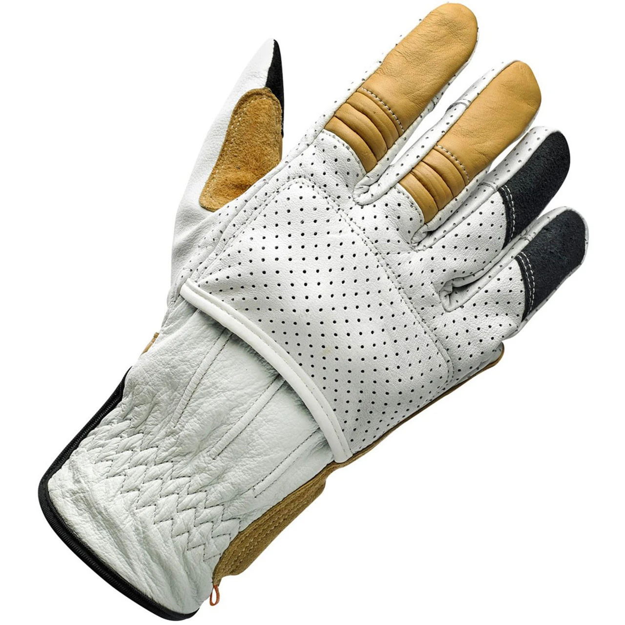 The Biltwell Borrego gloves are CE certified for motorcycle operation, which means a lot if you care about comfort and protection. Built tough on the outside, with a fleece Lycra half liner to absorb sweat. The Borrego Glove has rugged reinforcements in friction zones coupled with perforated panels for increased air flow. A positive wrist closure and high-impact knuckle guards contribute to the coveted CE rating, but Biltwell created them aesthetically low-key so you don’t look like a transformer while riding. These are good looking, impressively built leather gloves – this design coming your way in cement white, with yellow and black accenting.