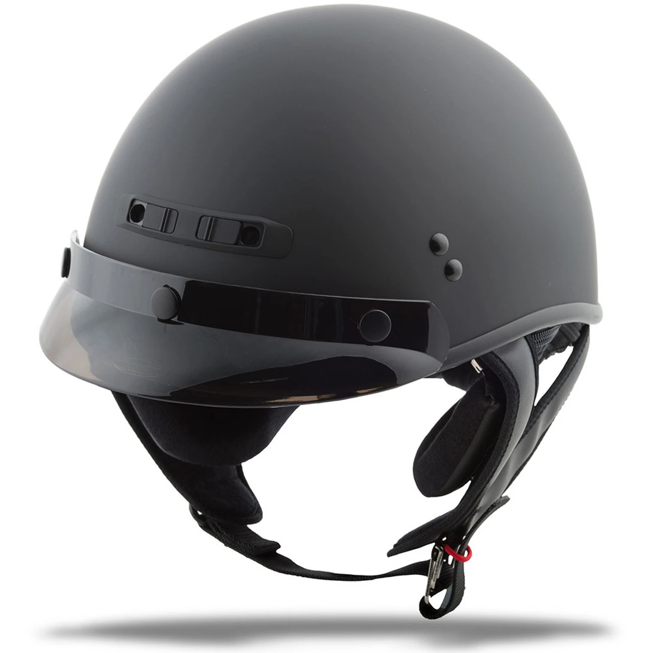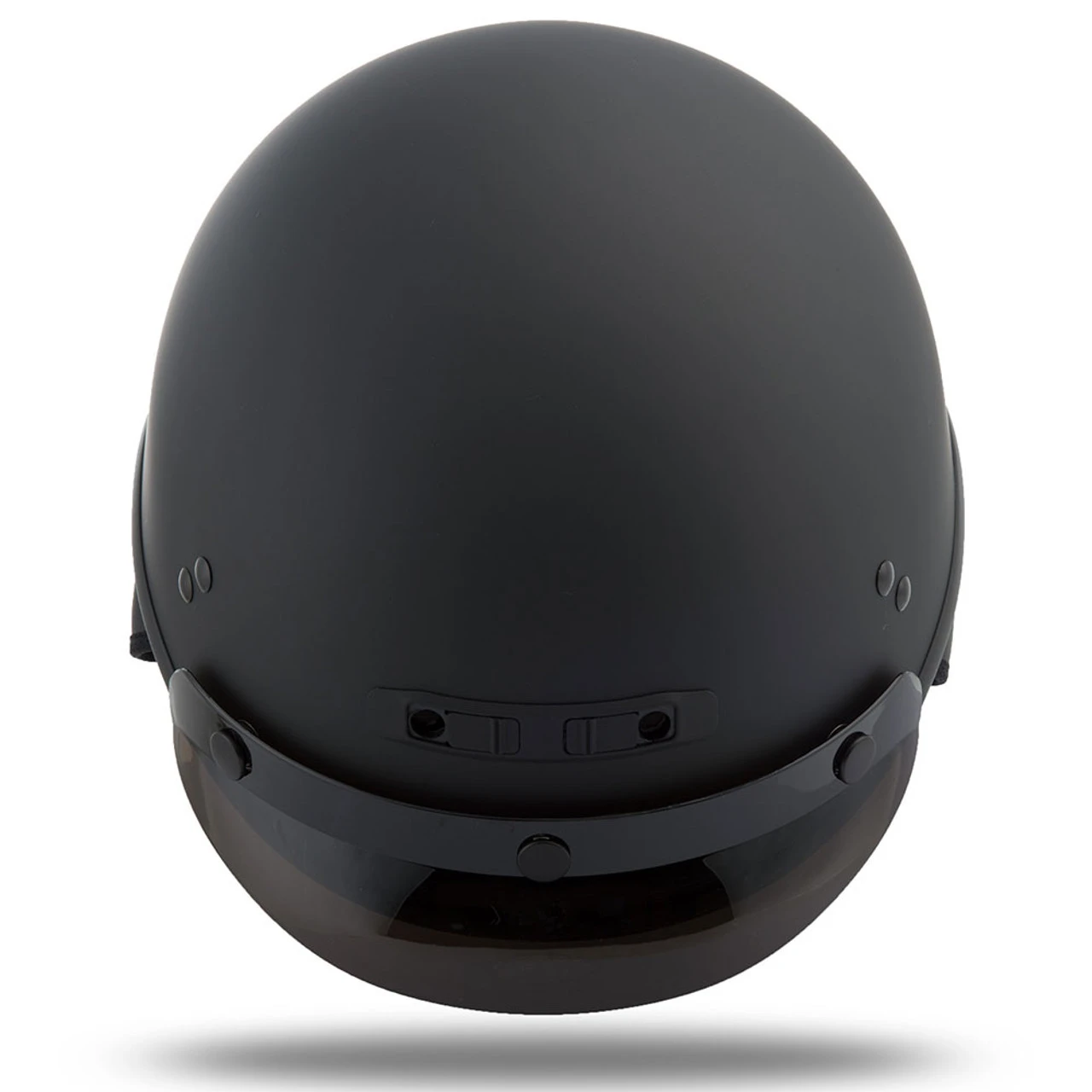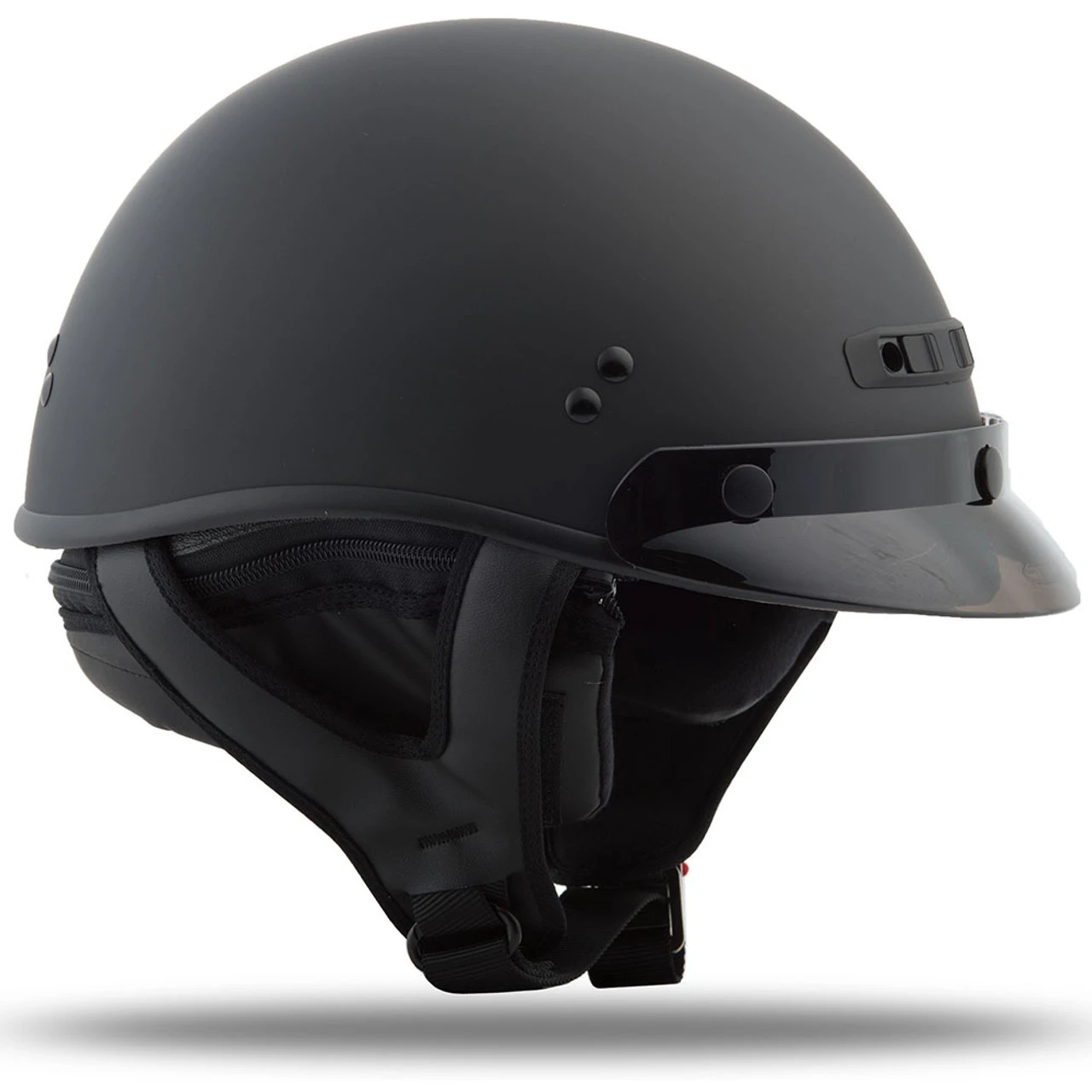 With its three snap visor, the Matte Black GMax GM-35 is a nice, versatile half helmet. You can choose between a traditional cruiser look with its included sun visor and neck curtain or opt for the naked look by removing both. The three snap gives you the option of installing a variety of shields and visors to suite your personal style and riding conditions.