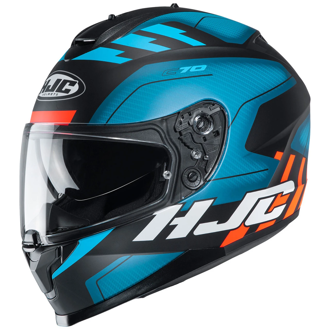 The HJC C70 Helmet gives tons of bang for minimal buck and the Koro graphic adds a sweet layer of style to a nice lid with a blue/black/orange graphic.