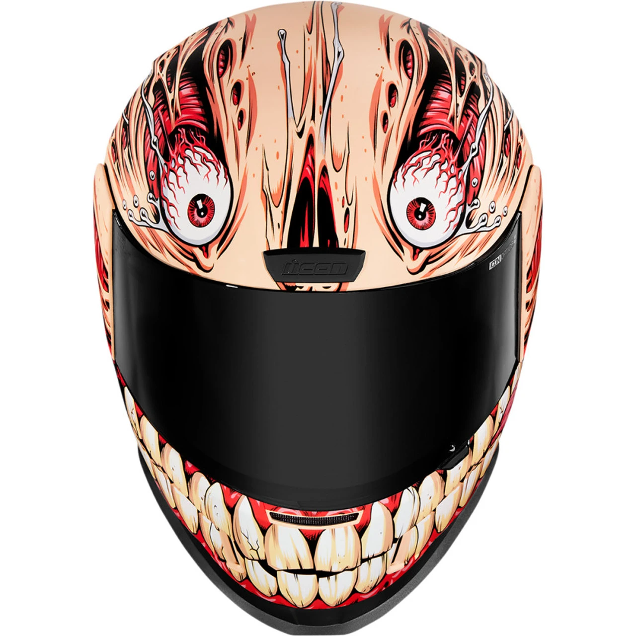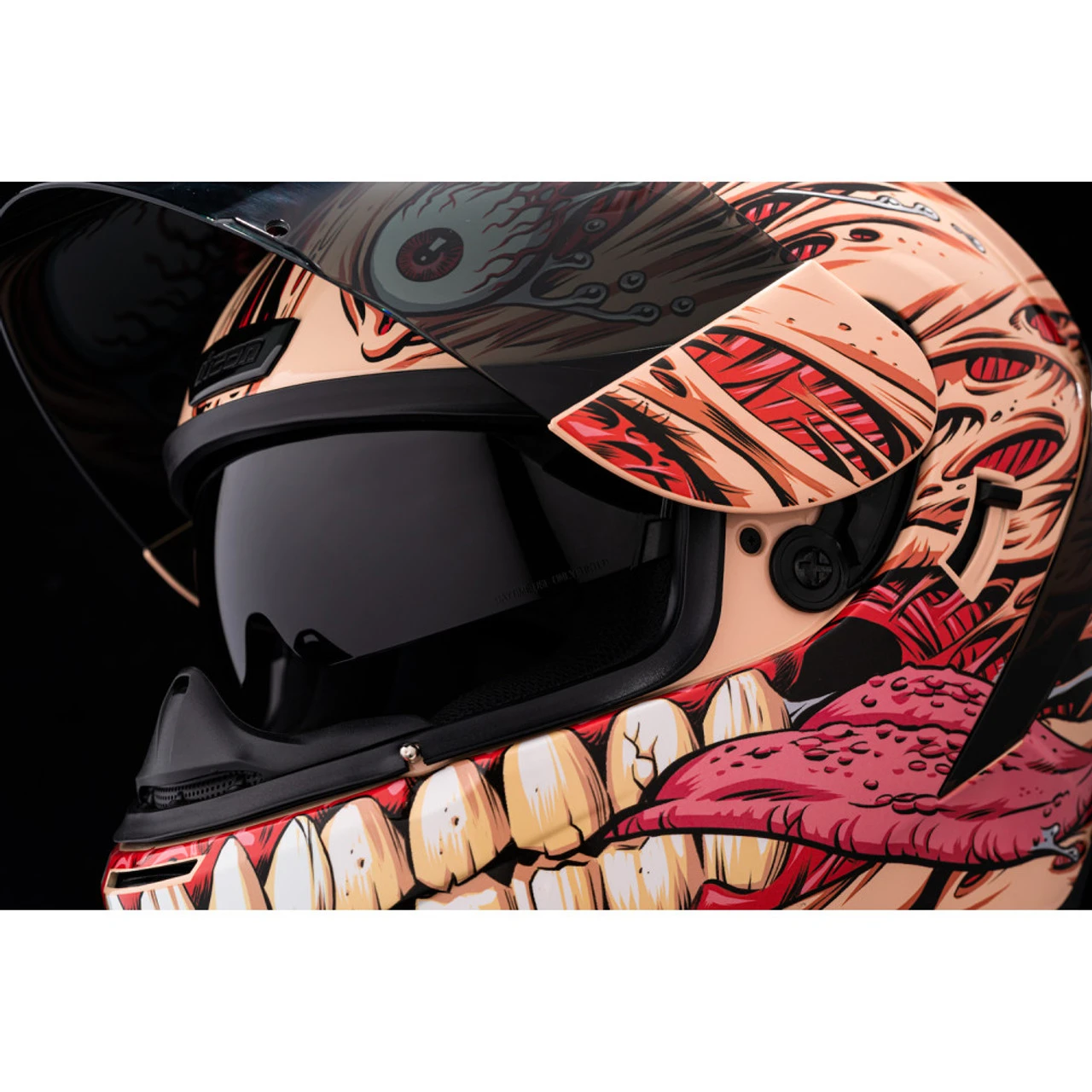 The Icon Airform Facelift Helmet continues Icon’s tradition of unique designs with a bulging eyeball, teeth clenched, tongue waving in the breeze look for riders who like to twist the throttle just a little more than most. This version comes in a skin tone peach for a touch of a realistic look while still maintaining Icon’s push-the-limits edge. Plenty of features packed in as usual to complement this unique design.