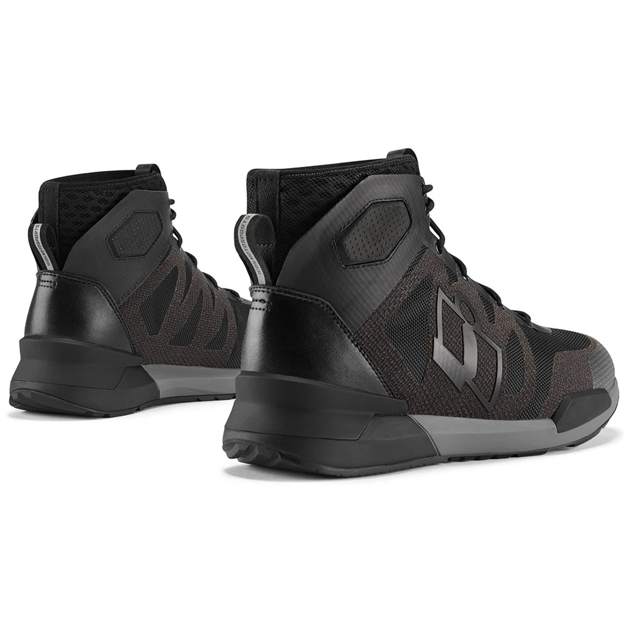 Street-style riding trainer built on an ultra-comfortable athletic footbed, the Hooligan shoe is up for the battle in the streets. The uppers are paired with a mesh bootie keeping the shoe light, breathable, and secure. The Kevlarยฎ toe overlays and D3Oยฎ ankle inserts provide legitimacy, while the axialmetric shank provides ample moto-specific support. So much more than a sneaker and less cumbersome than a boot, the Hooligan delivers the critical features for the urban motorcyclist. Pickup the Icon Hooligan Shoes in black for a look that keeps things fresh without sacrificing safety and moto performance. These Hooligans come in all black.