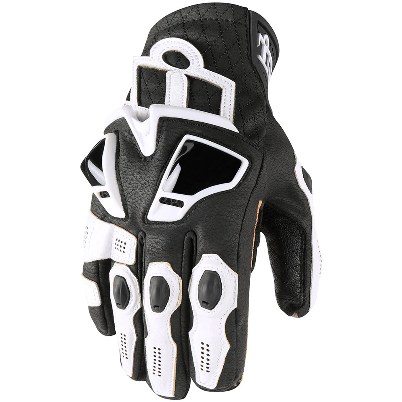 ICON is always searching for the upper hand; weโve found it with the Hypersport Short glove. The materials and construction of the Hypersport Short glove have been purposely chosen for their innate abilities to provide this advantage. The AxSuede Laredo chassis is paired with goatskin palm overlays and diamond stitch accents located in areas of high wear from grips. The palm sliders are in case of high-velocity asphalt encounters. Key construction techniques include ICONโs exclusive floating knuckle, which allows for maximum knuckle articulation, and an out-seamed finger box for all-day comfort. The Hypersport Short gloves feature full knuckle coverage from the vented TPU/Polycarbonate knuckle plates. A wrist hook & loop closure allows for a secure fit.