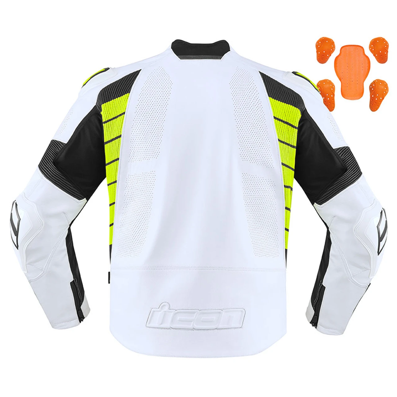 High speed performance: the Hypersport2 Primeโข jacket is the upper echelon of the ICON line. A stylish blend of 1.1-1.3mm TracSpecโข leather and textile, coupled with ICON’s Attack Fit, creates a jacket built for velocity. A full D3Oยฎ impact protector package (elbow, shoulder, back) and the accordion leather flex zones allow for a jacket that contours to your body straight off the rack. Deep chest pockets that double as chest vents, reinforced perforation zones, retro-reflective hits, and a padded microfleece comfort liner collar are just a few of the rider-centric details you’ll find. For the throttle jockey, we’ve added an internal waist zipper that connects to the Hypersport Primeโข pant, perfect for track use. Enjoy the Hypersport2 Prime Jacket in White/Gray/Hi-Viz.