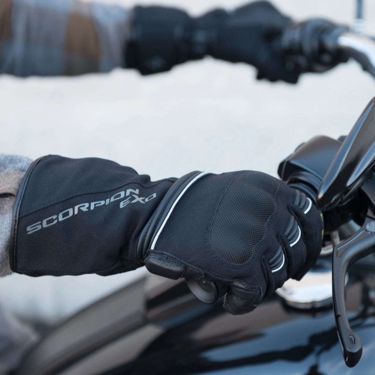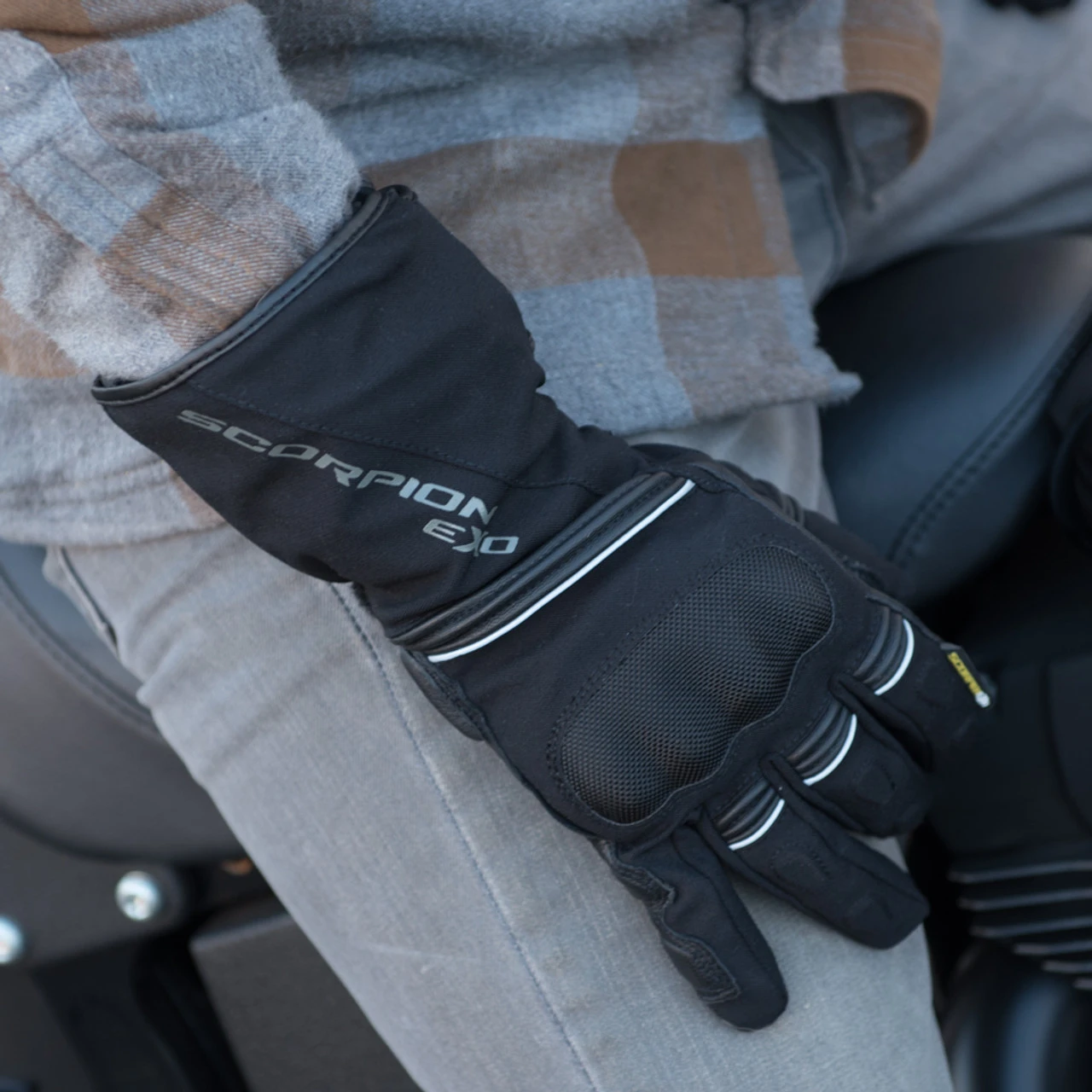 The Scorpion Tempest Waterproof Gloves are a solid choice for cooler seasons – they’ll keep your hands warm and dry and comfortable. Want to hit the road no matter the weather? The Scorpion Tempest Gloves will be your friend. You can have your motorcycle set up with all the custom parts you want and have the best riding gear, but if your hands are cold and wet from water running down your sleeves you won’t be enjoying your ride. That’s why we developed the Tempest glove. It’s a waterproof insulated glove with a unique double gauntlet which prevents water from running down your sleeve and getting your hands wet. One gauntlet goes inside your sleeve, and the other goes over your jacket creating an effective barrier. Additionally the glove is insulated with 100g of Thinsulate ® to make sure your hands stay warm. Now you’re ready to ride through a tempest.