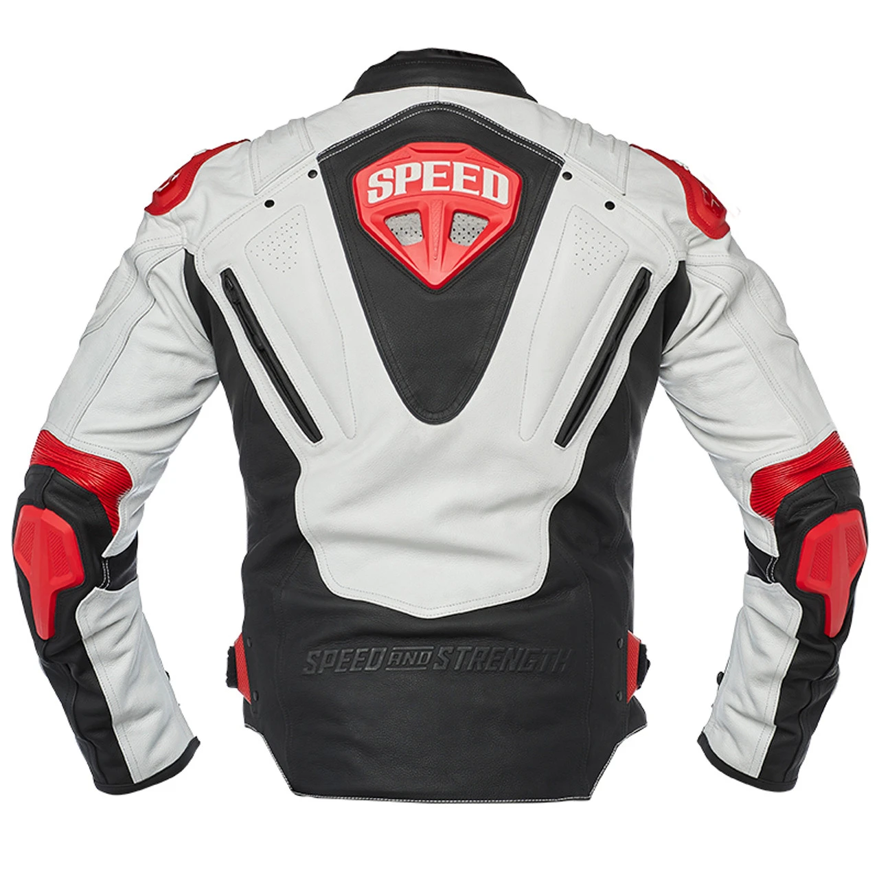 High performance protection without restriction, the Revolt Leather Jacket combines performance and style for all of the miles and then a few more. The Revolt Leather Jacket has you covered with Custom Molded TPU/TPR Armor on the Shoulders, Elbows and Back, along with Removable Knox Lite CE Armor in the Shoulders and Elbows. This jacket also improves your technique thanks to its Attack Position Performance Fit with Stretch Ribbed Elbow Panels for mobility that lets you move without restriction. Just pulling it on and zipping it up puts you into that free and adventurous state of mind. Our nod to the 90’s era sport bike, The Revolt fights the status quo and keeps you protected if things go sideways. This is an impressive motorcycle jacket that’s packed with features for the serious rider. Grab the Speed and Strength Revolt Leather Jacket in white with black and red to really set it off.